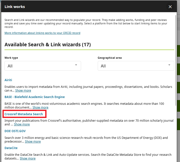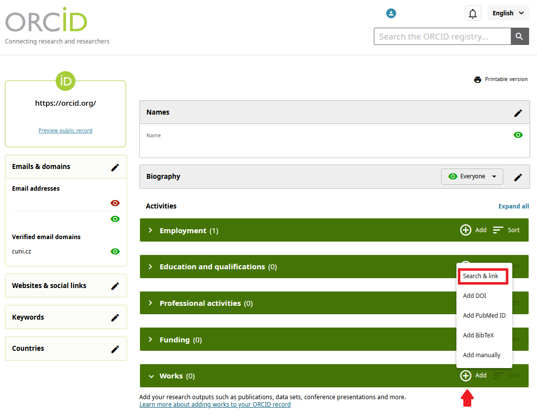 1) In the ORCID profile, scroll down to the Works section and use the “Add” instruction to make a selection via “Search & link”.