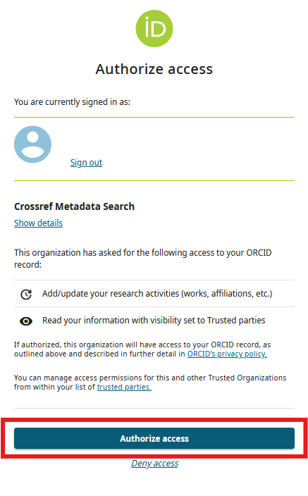 4) In the next step, you allow CrossRef to access your ORCID account and add records. To enable this, click on Authorize access.
